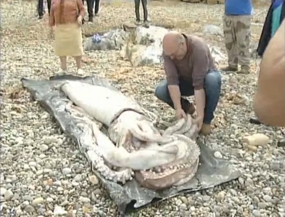 Eνα γιγαντιαίο καλαμάρι με υπερμεγέθη μάτια και πελώρια πλοκάμια που μοιάζει σαν τέρας από μυθιστόρημα του Ιούλιου Βερν , ξεβράστηκε την Τρίτη στην παραλία Λα Αρένα στην ισπανική κοινότητα της Καντάμπρια.