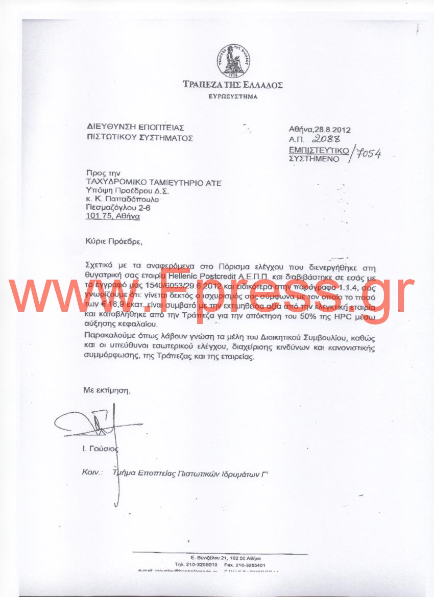 Ειδικότερα το έγγραφο που αποστέλλεται στις 28 Αυγούστου 2012 από τη Διεύθυνση Εποπτείας του Πιστωτικού Συστήματος και υπογράφεται από τον τότε Διευθυντή κ. Ιωάννη Γούσιο (ο συγκεκριμένος παραιτήθηκε το Νοέμβριο του ίδιου έτους από υπάλληλος της ΤτΕ) αναφέρει ότι γίνεται δεκτός ο ισχυρισμός της τότε διοίκησης του ΤΤ (Διευθύνων Σύμβουλος Κλέων Παπαδόπουλος) σύμφωνα με τον οποίο το ποσό των 18,9 εκ Ευρώ που καταβλήθηκε για την απόκτηση του 50% της Hellenic PostCredit (πρώην Best Line) είναι συμβατό με την εκτιμηθείσα αξία από την ελεγκτική εταιρία (σ.σ. Deloitte). Αξίζει να σημειωθεί ότι η Best Line ανήκε στον επιχειρηματία Δημήτρη Κοντομηνά και βάση του εισαγγελικού πορίσματος το τίμημα είναι ιδιαίτεραυψηλό ενώ εγείρονται και ζητήματα για τον τρόπο ανάθεσης της αποτίμησης, του τρόπου αποτίμησης και των στοιχείων που χρησιμοποίησε η ελεγκτική εταιρία για να αποτιμήσει την προς εξαγορά από το ΤΤ εταιρία.