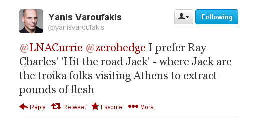 Μια διαφορετική σειρά tweets έκανε ο Γιάννης Βαρουφάκης. Aσυνήθιστα κεφάτος απαντά στα περί τρόικα αφιερώνοντάς της διάφορα τραγούδια.