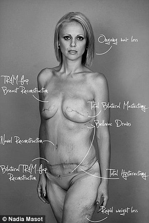Μετά από την επέμβαση πόζαρε στη φίλη της φωτογράφο Nadia Masot γυμνή, θέλοντας να δείξει όλα τα σημάδια που άφησε η περιπέτεια της στο σώμα της. Εφτιαξε μάλιστα και ειδικό σχεδιάγραμμα για να φανεί πώς αφαίρεσε τις ελιές της αλλά και τους λεμφαδένες της.